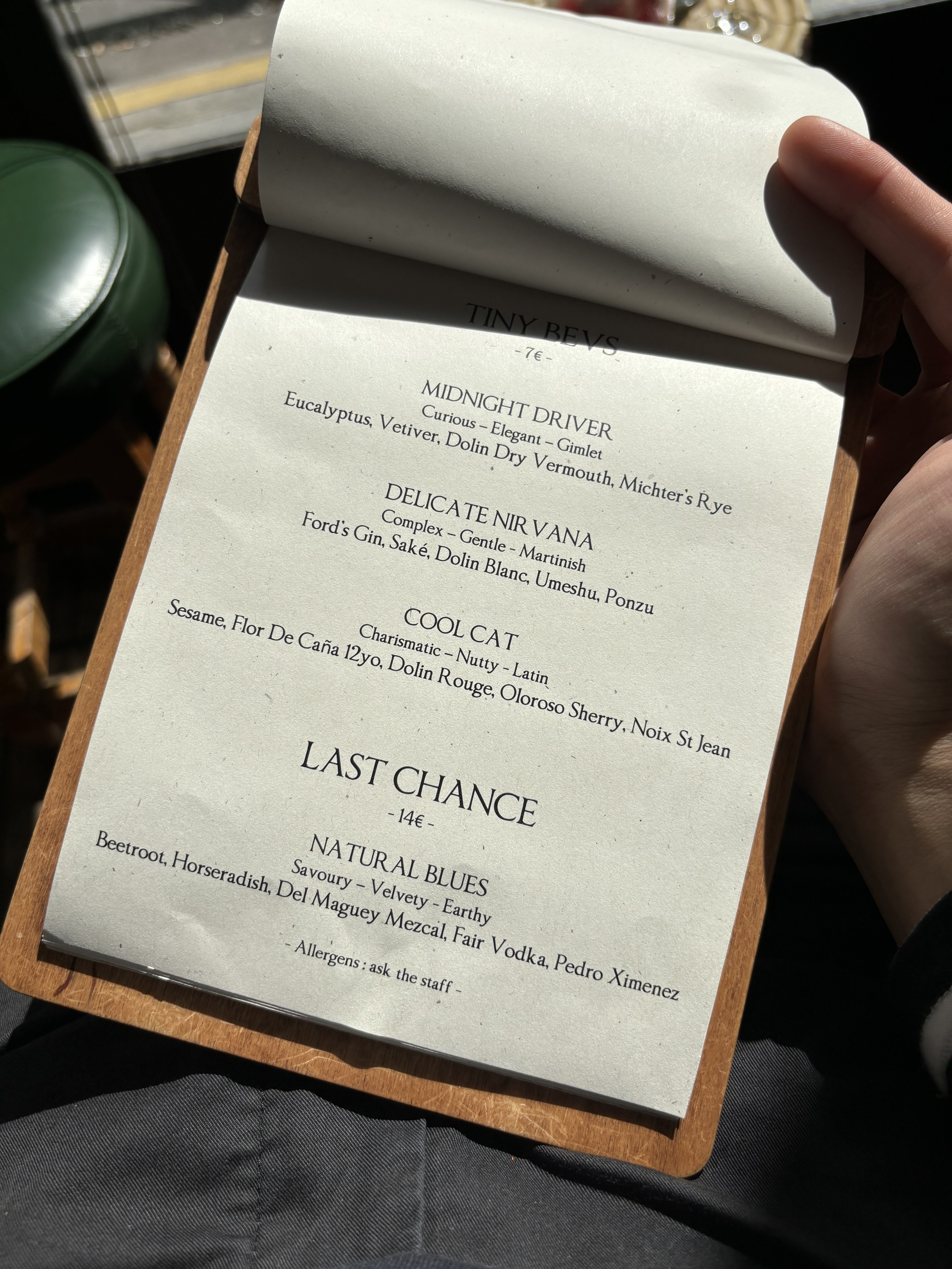 Des cocktails uniques ! J’ai vraiment adoré l’espace et son ambiance. Nous avons essayé ces cocktails : Gimlet Julep, Good boy, Babylon Sisters et un cocktail mixte à la Chartreuse. 💚 Oh, et ils ont les toilettes les meilleures et les plus réfléchies ☺️