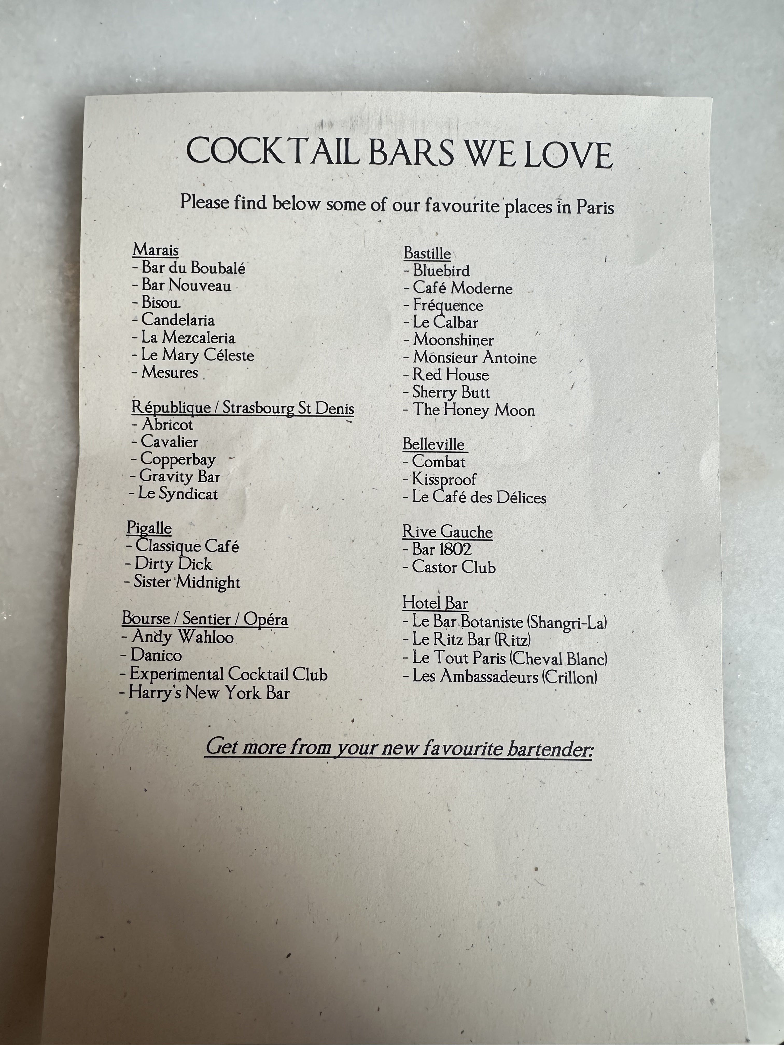 Un de mes préférés à Paris ! Service haut de gamme, cocktails sans alcool incroyables. Toujours un bon moment !