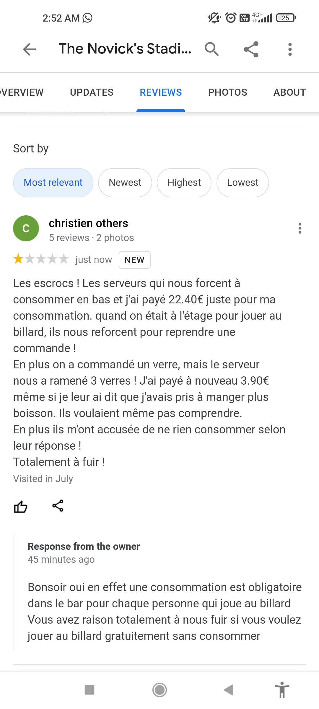 Nous sommes venu aujourd’hui faire un billard avec 3 amis ! Deux d’entre eux font le ramadan… « consommation obligatoire par personne » donc je lui explique que pour deux d’entre nous ce n’est pas possible ! Et la, on me répond que c’est obligé pour rentrer dans le bar et pouvoir faire un billard ! Veuillez m’excuser mais ce n’est pas normal d’être « obligé » ! Et j’ai seulement eu « c’est le patron désolée madame »… est-ce normal même ?