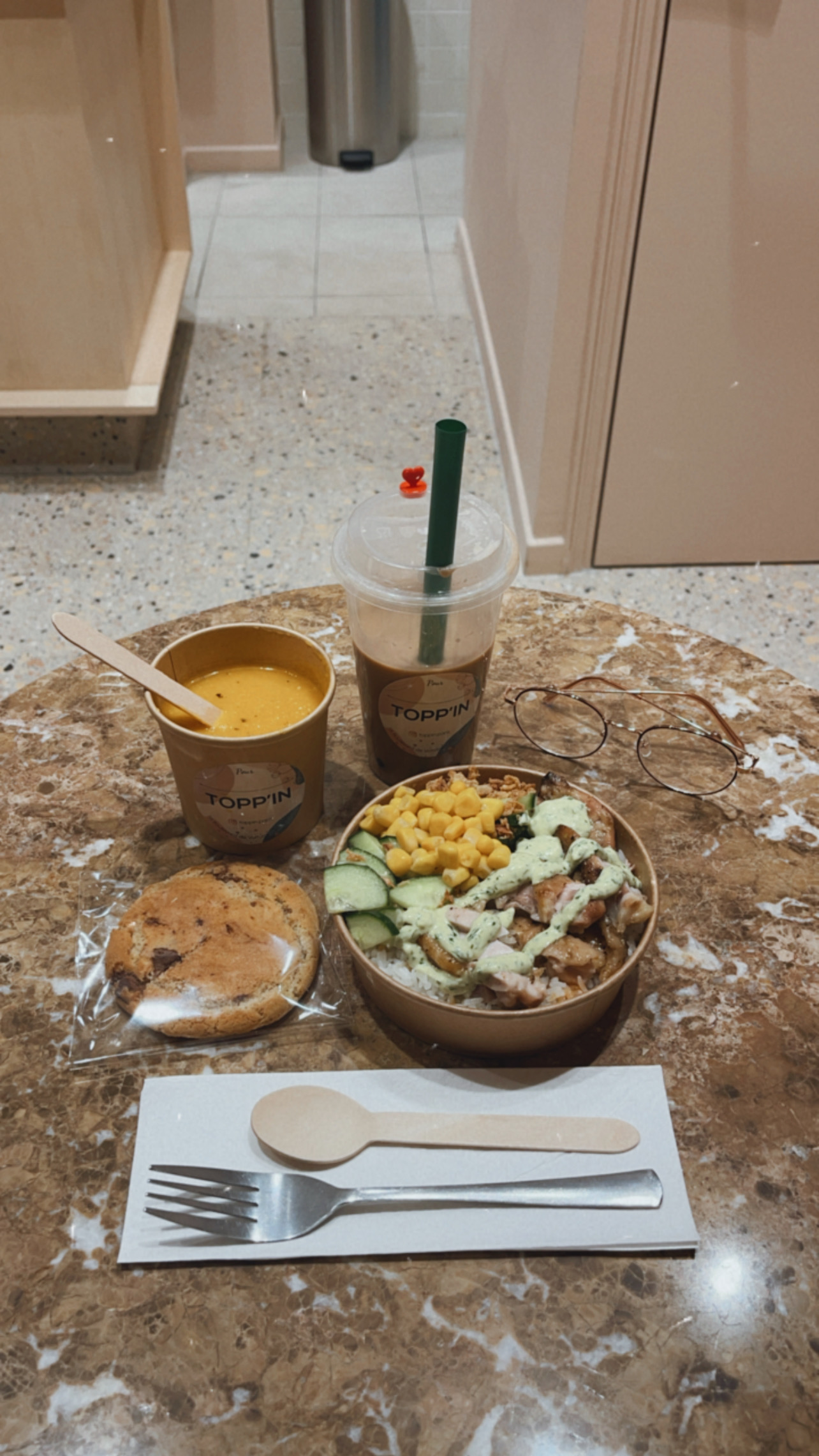 Un très bon moment passé chez Topp’in! Équipe chaleureuse, poké bowl chaud au poulet : coup de cœur. Le cookie avec le café pour terminer, tout ce que j’aime. C’est frais, réconfortant en cet hiver qui approche… et on valide la playlist musicale. L’endroit est joli, cosy. Je reviendrai avec plaisir dès que je serai dans le quartier.