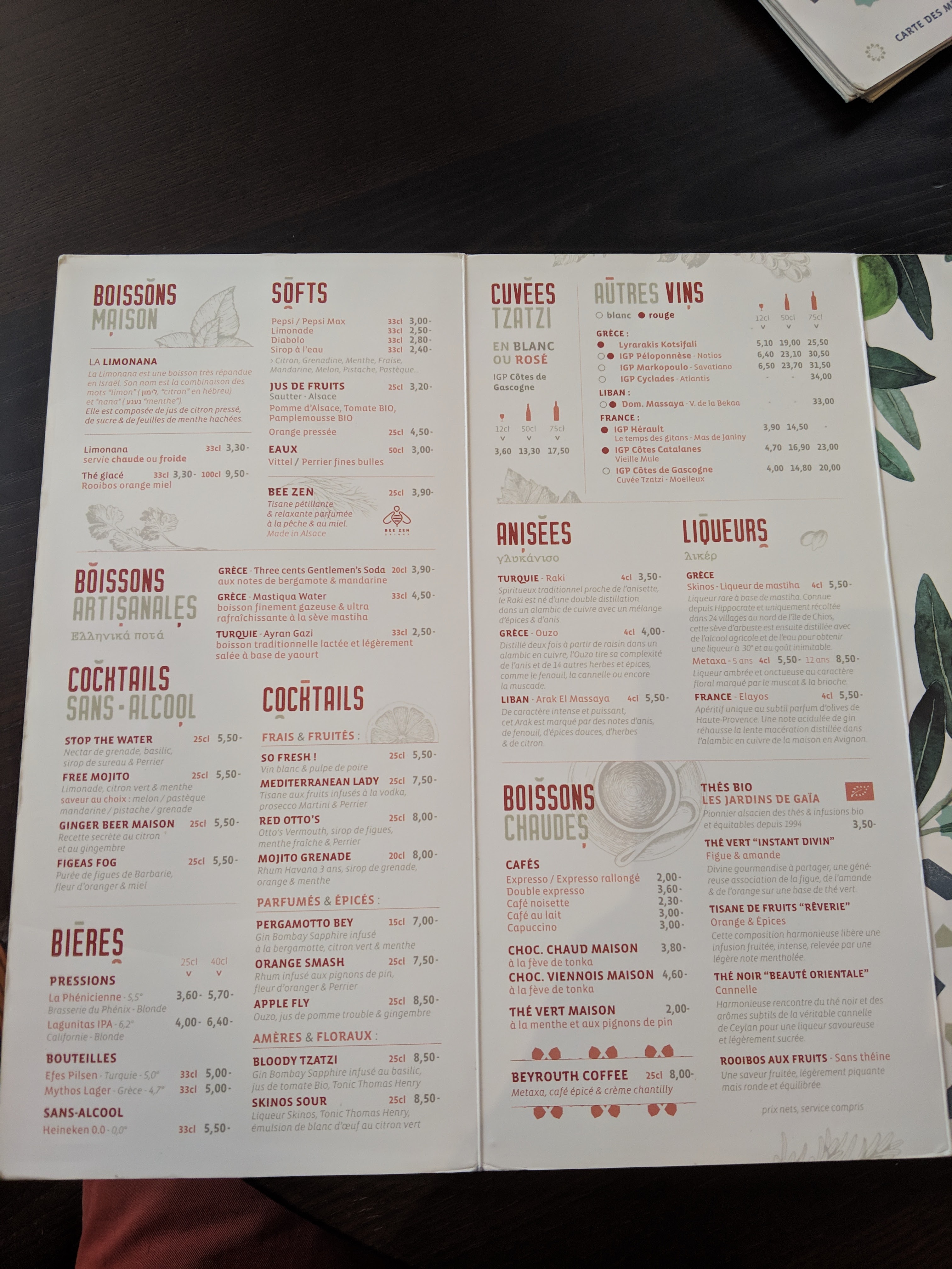 Le Tzatzi est un bon restaurant à Strasbourg, ses falafels sont vraiment délicieuses et il propose un large choix de spécialités méditerranéennes généreuses. Il est bien situé à Strasbourg et au calme. Après ça reste un restaurant méditerranéen classique, aux saveurs traditionnelles mais pas exceptionnelles. Le rapport qualité-prix est assez moyen. Un houmous, un pide et une boisson m’ont coûté 17 euros, c’est assez cher je trouve. Enfin, le service pourrait-être mieux et c’est aussi dommage que la carte restaurant ne fonctionne pas au Tzatzi. À vous de choisir !
