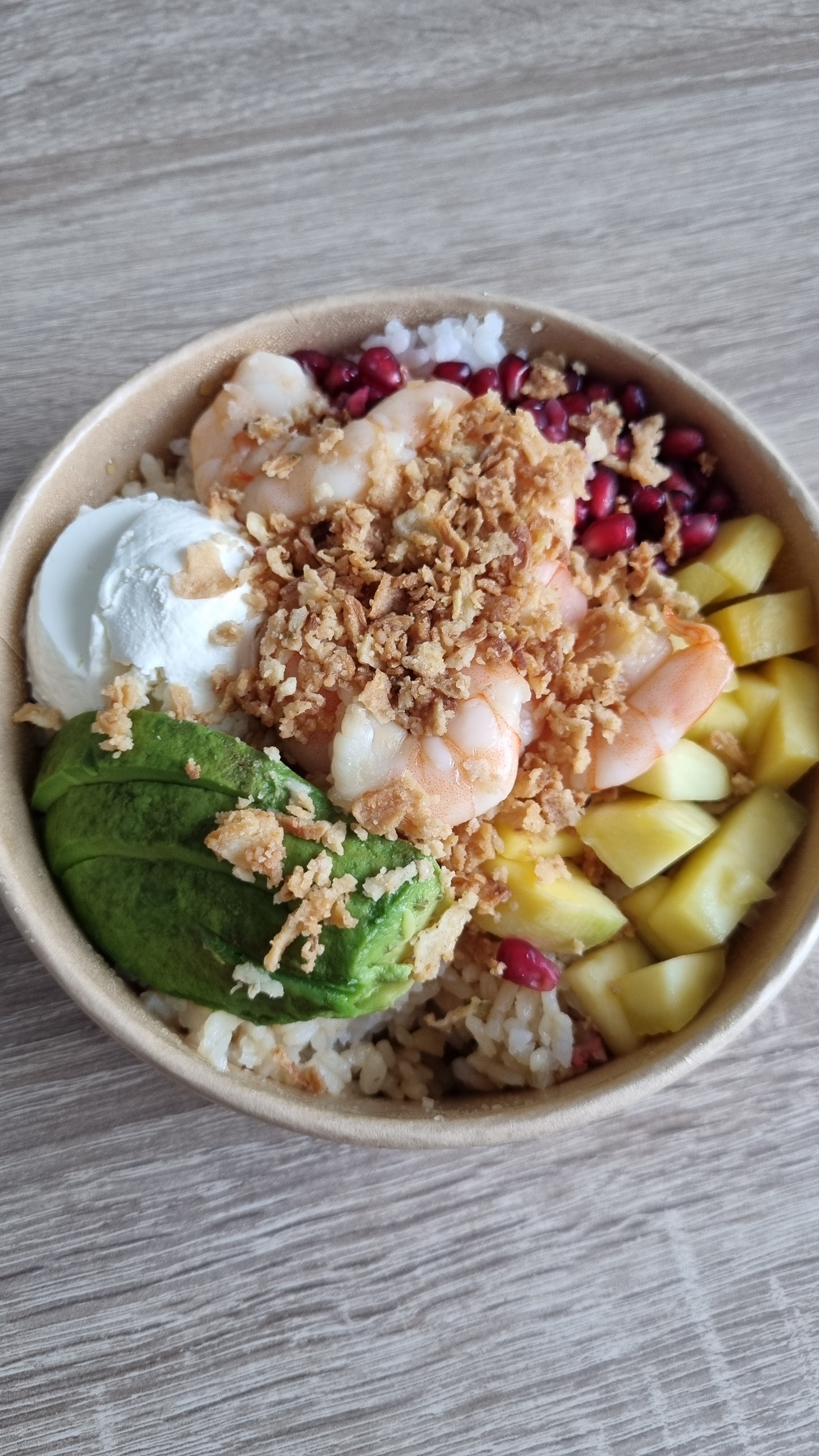🍚 Poke bolw personnalisé : Riz, saumon, mangue, oignon, radis, concombre, edaname, sauce coco mango il me semble et oignons frits en topping. L’accueil était super et le plat super bon ! Si j’habitais plus proche, je viendrais plus souvent c’est certain 🤤 Seul bémol : c’est un peu serré dans les récipients à emporter si on veut tout mélange dès le début. 🙂