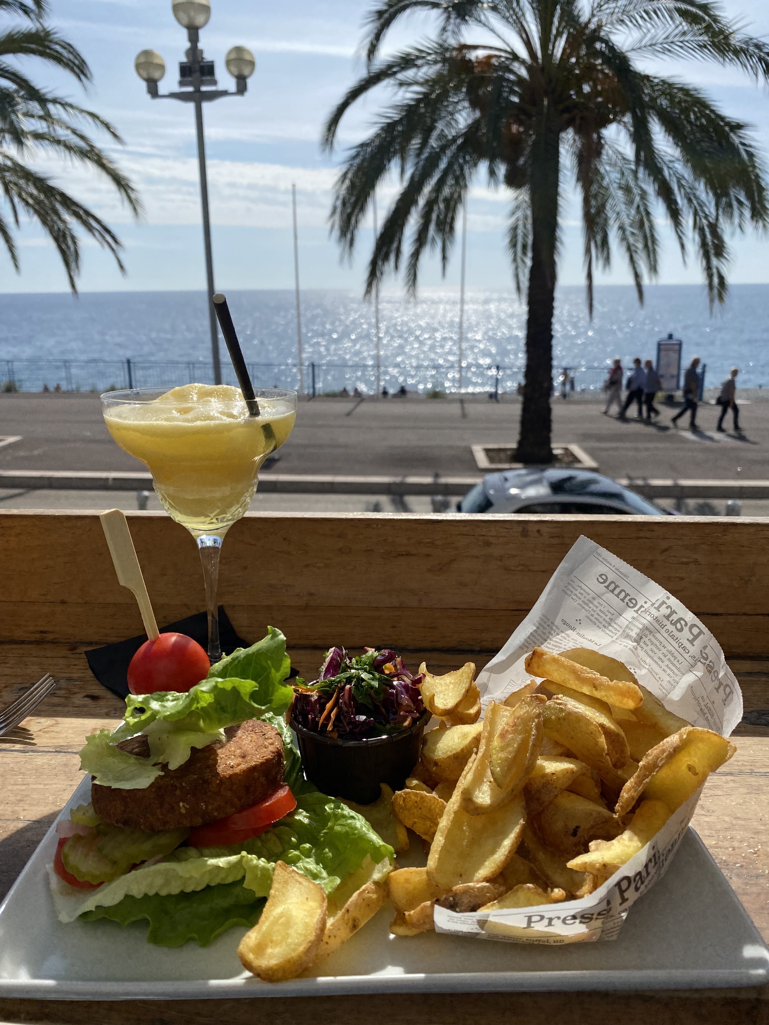 Le burger etait excellent. Les frites s chips exceptionnelle. Le service rapide et agreable. Des balcons terrasses avec vue panoramique sur la baie des anges. Avec du soleil c'est un grand moment de plaisir.